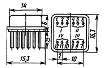 Транзисторные сборки 1ТС609Б, состоящие из четырех германиевых диффузионио-сплавных р-п-р переключательных высокочастотных маломощных транзисторов.